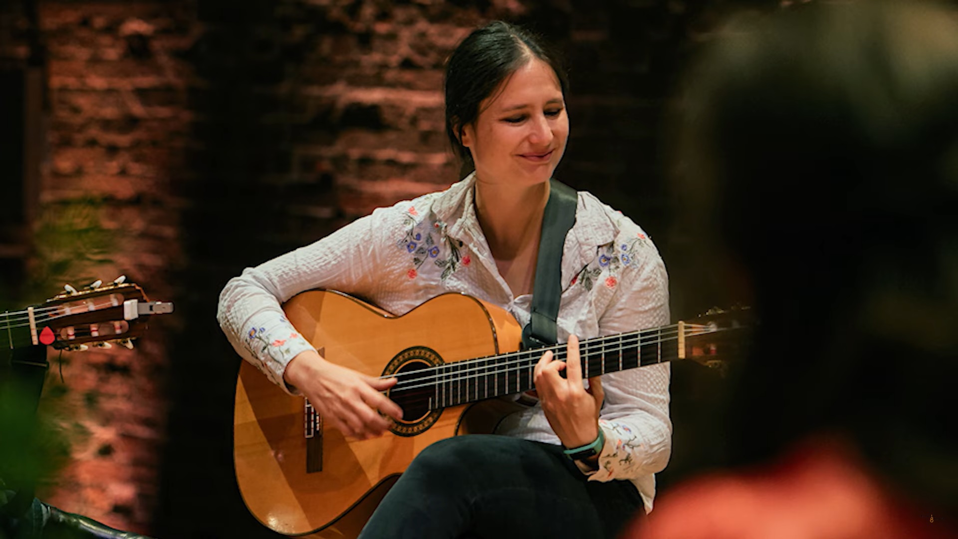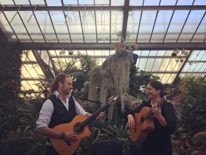 A stunning live performance from a Spanish guitar duo, creating a warm and romantic Mediterranean-inspired atmosphere